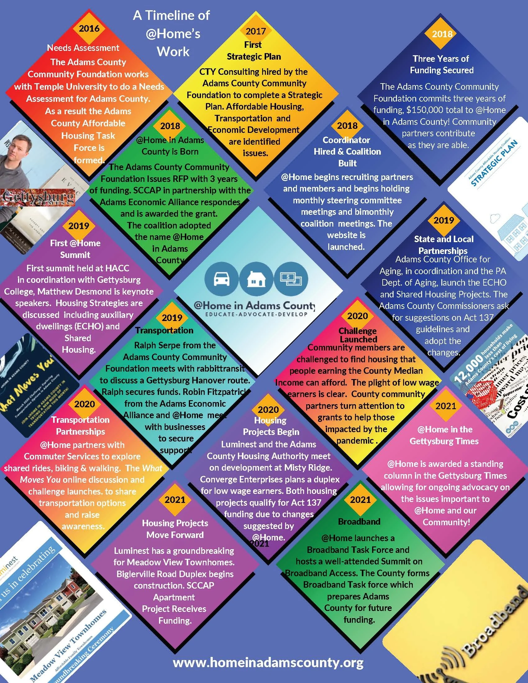 In response, the Adams County Community Foundation commissioned the development of a strategic plan and issued a request for proposals to implement a coordinated community initiative. In 2018, @Home in Adams County was launched, and South Central Community Action Programs was selected to facilitate the initiative in coordination with the Adams Economic Alliance as the economic development partner. The Adams County Community Foundation provided funding to support the first three years of the initiative.