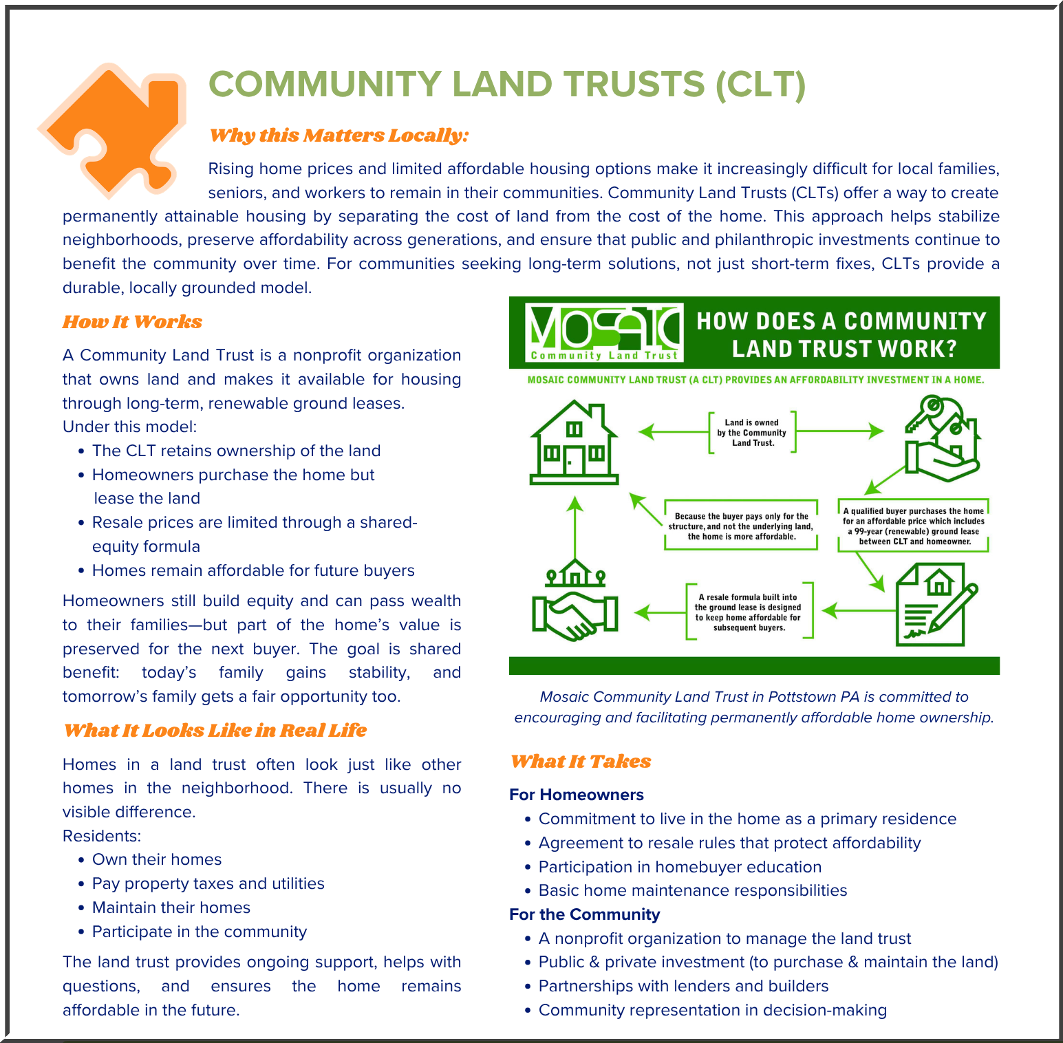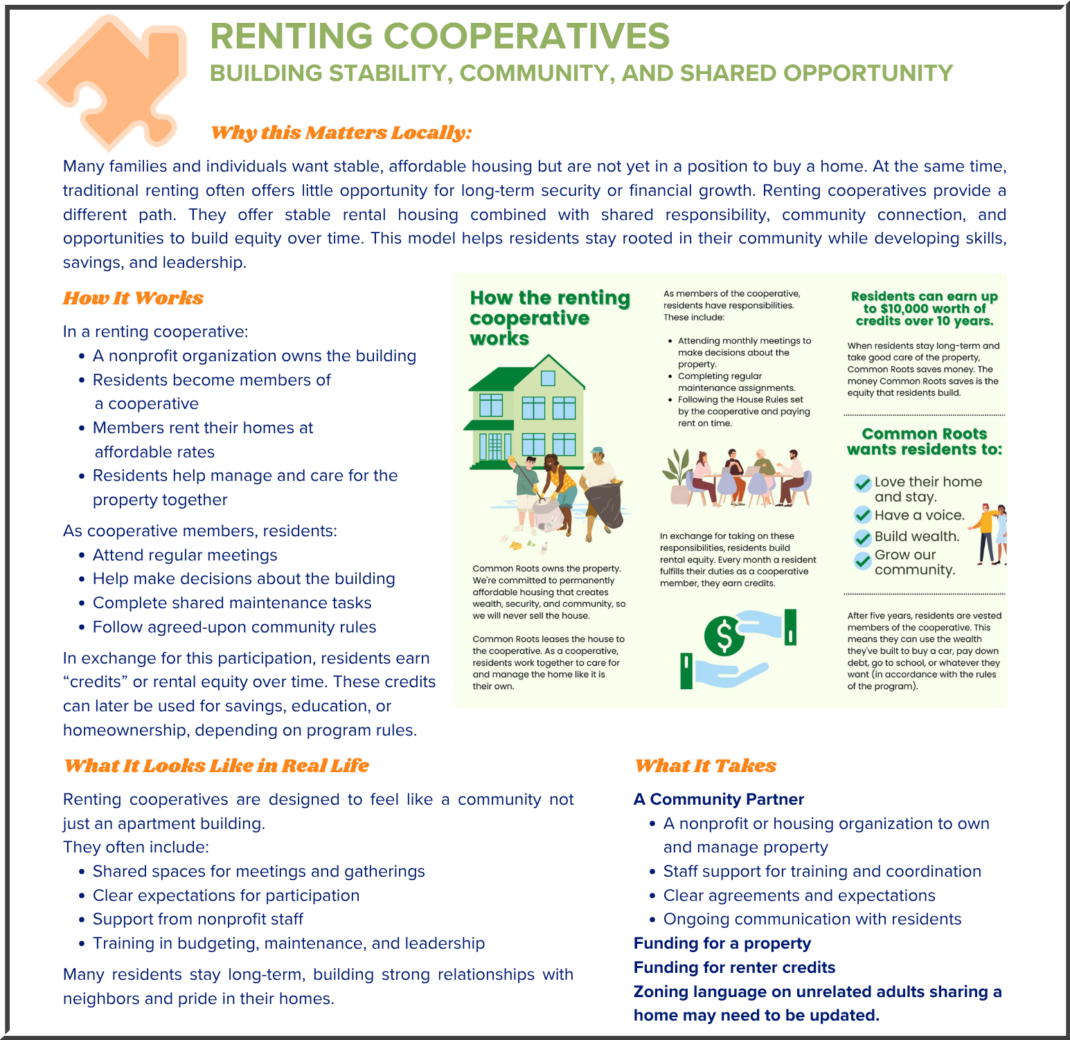 Community land trusts and rental cooperatives are innovative models that help preserve long-term housing affordability and expand local ownership opportunities. A community land trust is a nonprofit organization that acquires and holds land to ensure it remains affordable over time. Homes on the land can be rented or purchased, but resale restrictions keep prices within reach for future households, preventing displacement and maintaining community stability. Rental cooperatives, or co-ops, are housing communities owned and governed collectively by residents. Instead of renting from a landlord, residents share responsibility for management and decision-making, which can reduce costs and build community connections. Both approaches help create stable, attainable housing options, support local residents, and ensure that housing remains affordable for generations.