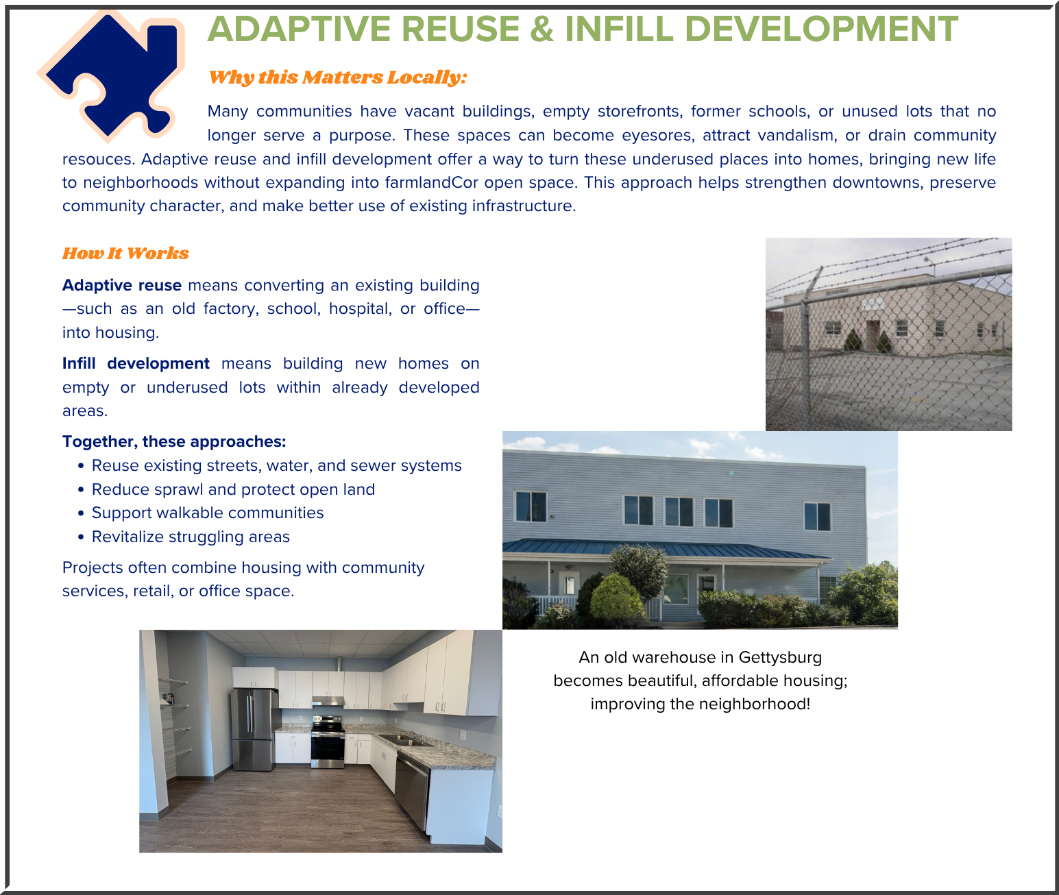 Adaptive reuse and infill development emerged as a highly rated solution by community participants because it balances growth with preservation of local character. These approaches focus on revitalizing underutilized buildings, redeveloping vacant or underused parcels, and adding housing within existing neighborhoods rather than expanding outward.
