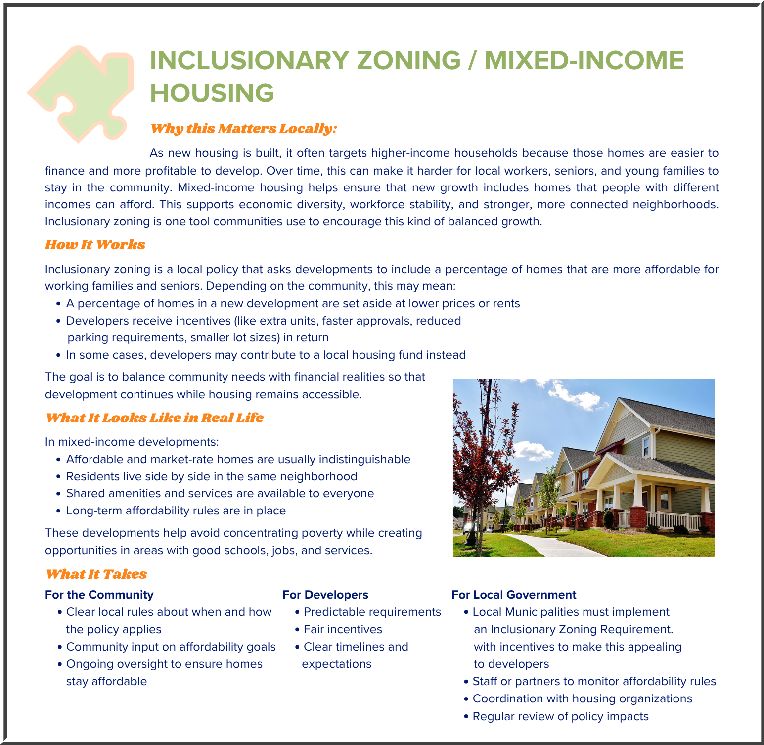 Inclusionary zoning encourages or requires a portion of new development to be affordable for households with a range of incomes, helping ensure that growth benefits the whole community.