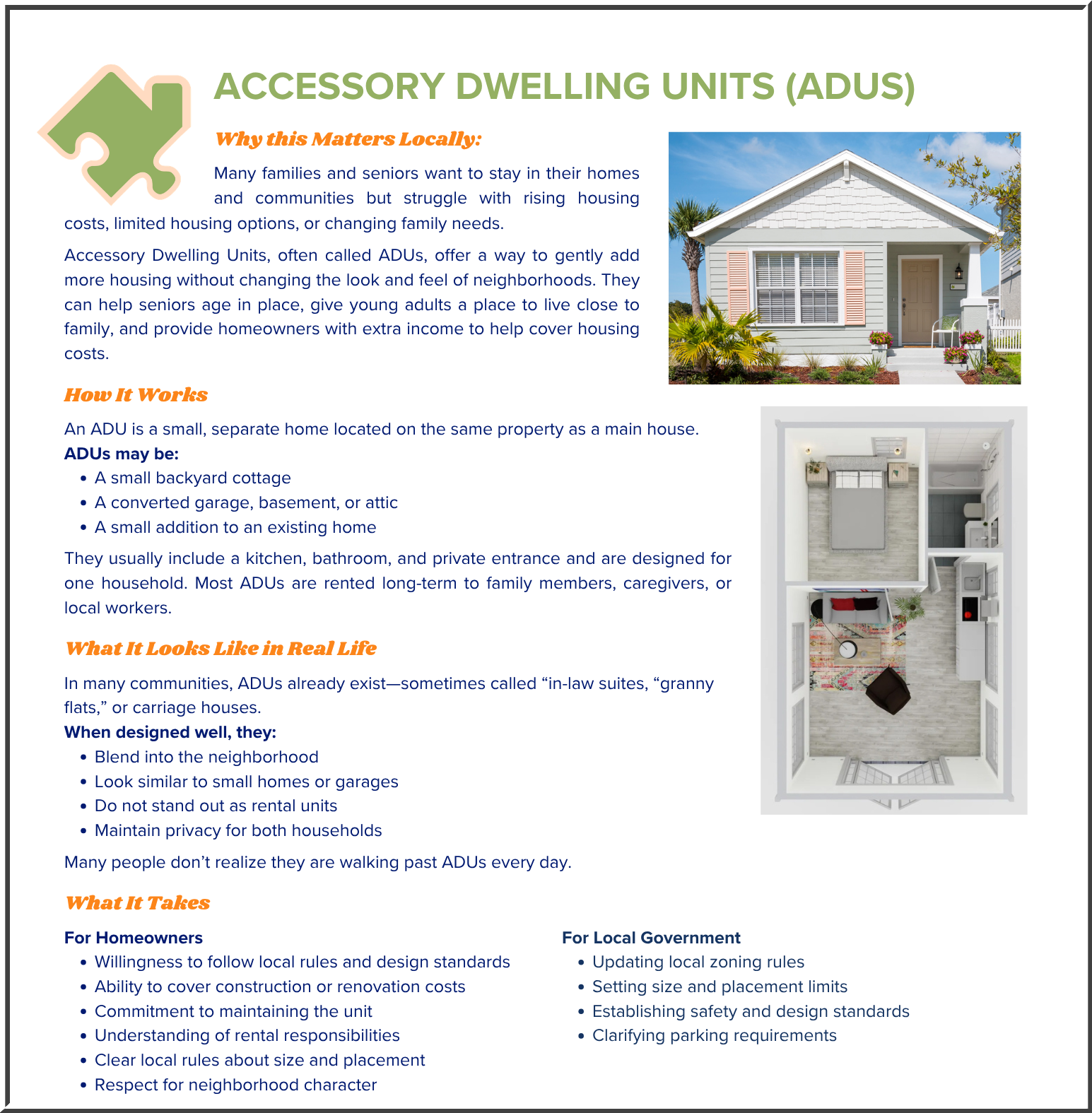 ADUs, in particular, can create opportunities for aging in place, rental income, or housing for caregivers and family members. By allowing modestly sized homes on smaller lots, communities can expand housing options in a way that is thoughtful, cost-effective, and responsive to local needs