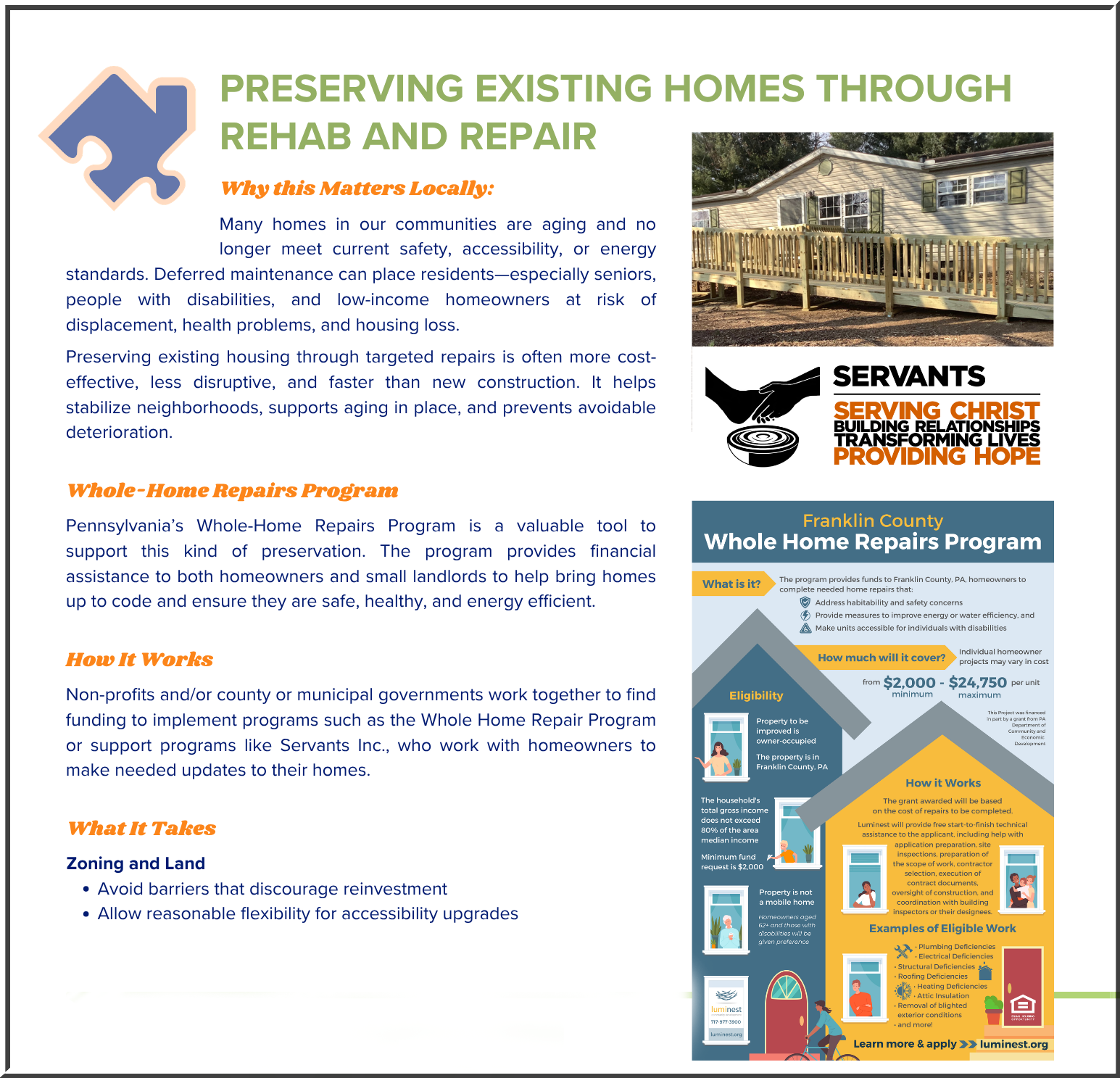 Rehabilitation can also improve energy efficiency, lower utility costs, and extend the life of older housing stock. By maintaining existing homes, communities can protect neighborhood character, stabilize property values, and avoid the higher costs associated with new infrastructure.