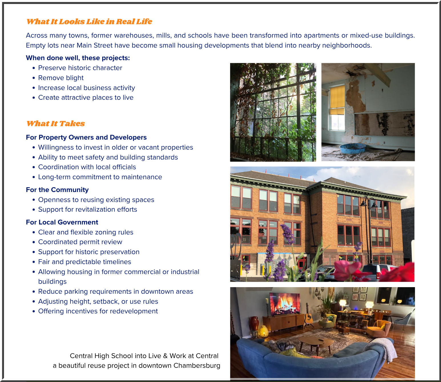 Participants appreciated that infill and adaptive reuse can create smaller, more attainable housing options—such as apartments over storefronts, conversions of large homes, or redevelopment of vacant lots—while making efficient use of existing infrastructure like roads, water, and sewer.