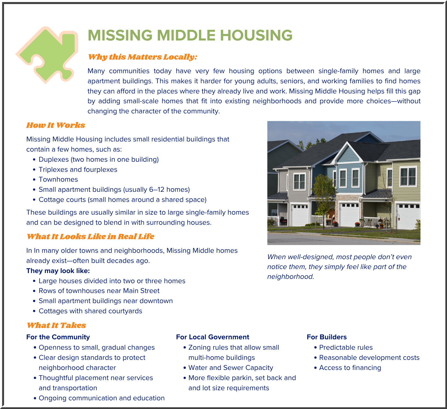 Mixed-income housing integrates homes at different price points within the same development, supporting economic diversity while avoiding concentrations of poverty. Missing middle housing refers to smaller-scale housing types—such as duplexes, triplexes, townhomes, cottage courts, and small apartment buildings—that fit within existing neighborhoods and provide options for seniors, young workers, and smaller households.